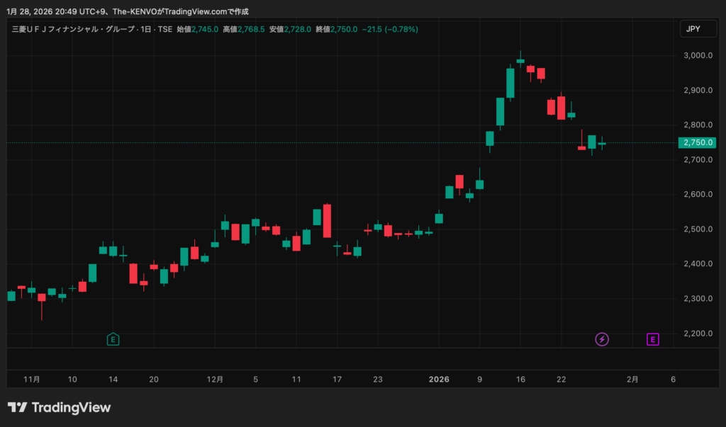 2026年に入ってから、三菱UFJフィナンシャルグループ(以下 “MUFG”)の株価は上値の重い展開が続いています。利回り・配当が魅力とされる一方で、世界経済の不透明感や金利動向の変化、短期マクロ懸念が投資家心理を冷やしていることが背景です。今週も売買代金上位に顔を出し、個人・機関の両方で注目される銘柄となっています。