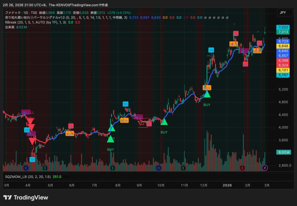 「売り枯れ買い枯れリバーサルシグナルv1.0」と独自のブレイクアウト・インジケーター「Range Breakout(株式用)」を乗せて、BUYとSELLシグナルを描出しています。