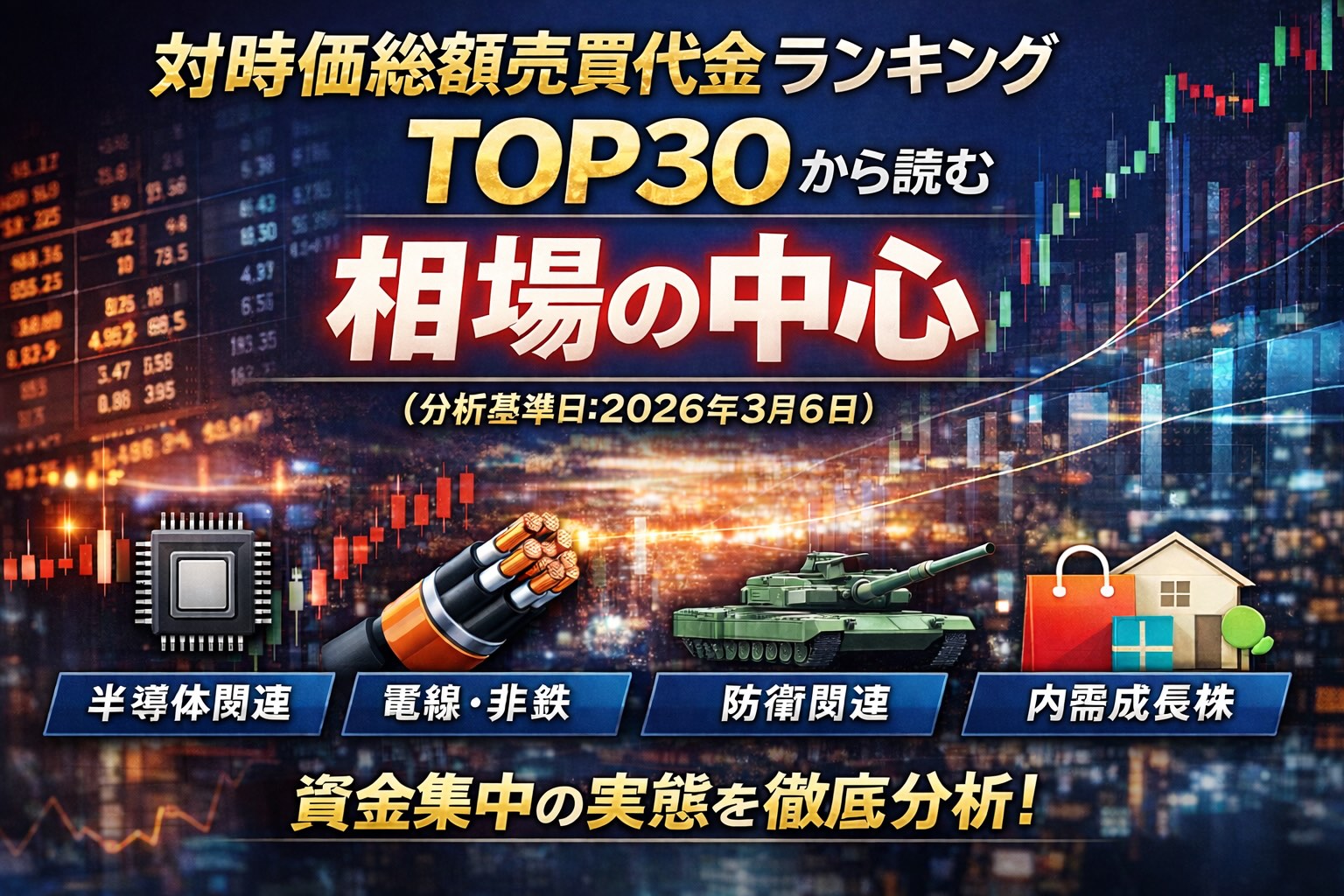 TOPIXとの比較でも同様で、TOPIXは時価総額加重であるため、相対的に大型株の影響が強い。3月6日は日経平均+0.62%に対しTOPIX+0.39%で、指数上昇は確認できるが、中心度上位の多くは中大型の“テーマ株”であり、メガキャップ全面高とは言いにくい。したがってこの日の市場は、指数は大型株、資金の中心はテーマ高回転株という二層構造だった。