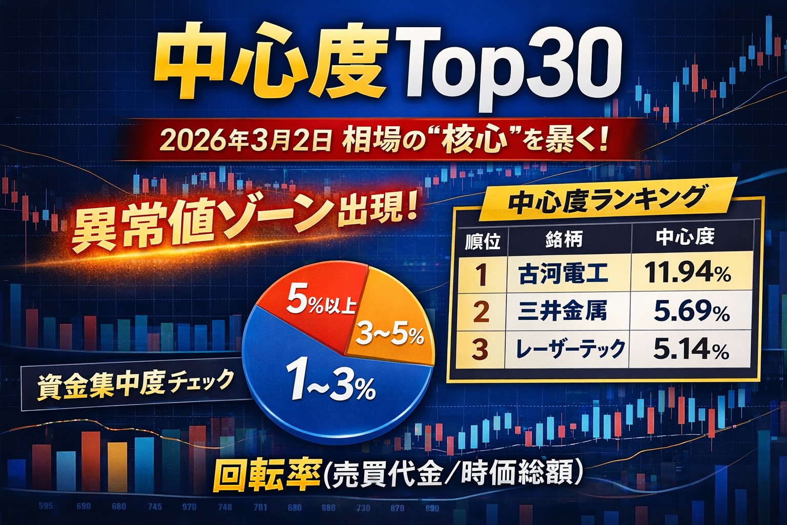本日は「指数の上下」よりも、「どこに資金が回転したか」が輪郭を作った一日だった。中心度の分布は明確に歪み、異常値ゾーンが3銘柄(中心度5%以上) 出現。さらに 3〜5%の強い資金集中が5銘柄 と続き、Top30の大半(22銘柄)は1〜3%に密集した。つまり、相場全体が均等に盛り上がったのではなく、特定テーマに短期資金が集中し、回転の速い売買で中心度が跳ねた構図である。