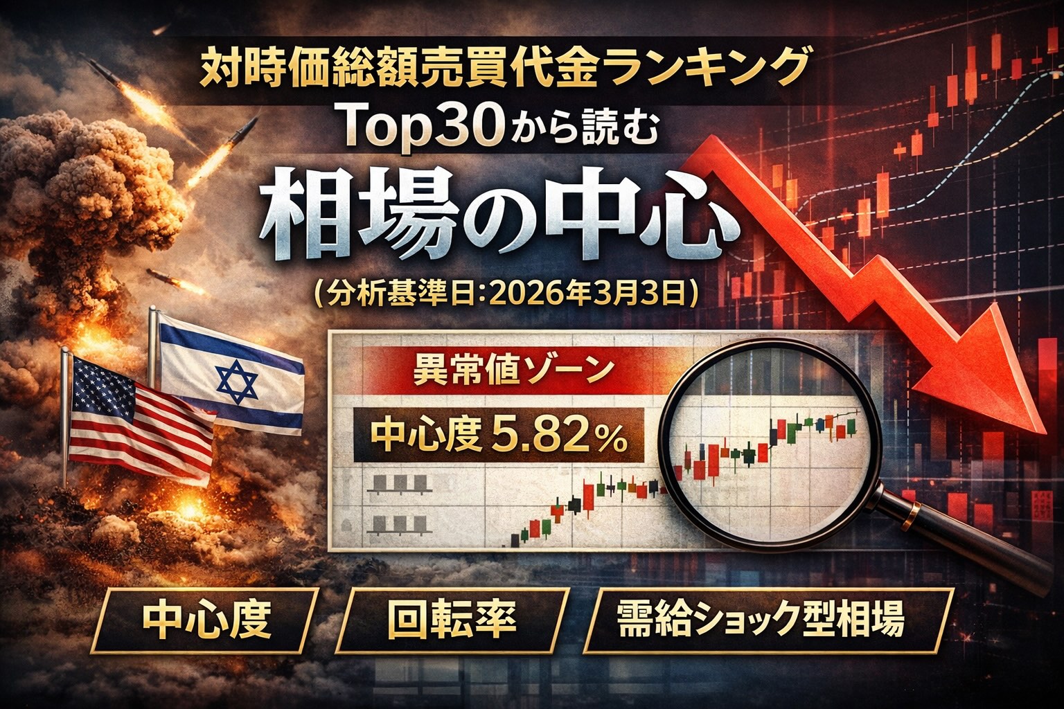 米国とイスラエルによる対イラン軍事行動の緊迫化でリスクオフが加速し、日経平均は大幅安となった(終値-3%程度の下落)。 こうした「指数全体が売られる日」でも、中心度(=回転率)が跳ねた銘柄には、その日の資金の逃げ場・ぶつかり合いが表れる。本日の中心度分布は、異常値ゾーン(5%以上)が5銘柄、強い資金集中(3〜5%)が2銘柄、残り23銘柄が1〜3%に収まり、資金集中は一部に偏在している。一方で「売買代金上位かつ値上がり」の銘柄は限定的で、中心度が高くても株価は下落しているものが多い。つまり今日は“買いの集中”というより、下げ局面での解消売買・短期回転が中心度を押し上げた日と読むのが妥当だ。