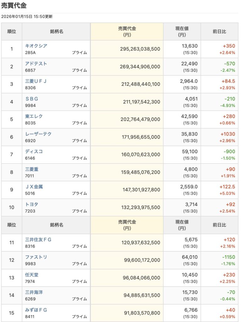 日経平均株価およびTOPIXはいずれも方向感に乏しい推移となった一方で、売買代金上位銘柄には金融・資源・半導体・大型テックといった日本株の中核セクターが顔を揃え、マーケットの主戦場は依然として大型主力株に集中している。