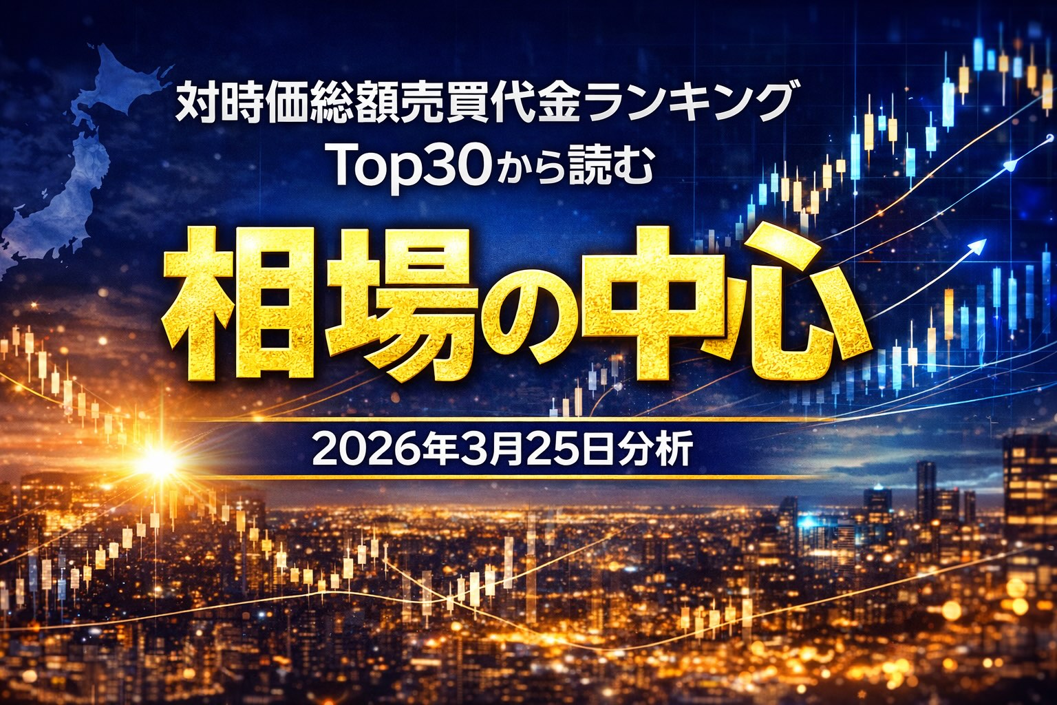 2026年3月25日の東京株式市場は、日経平均が前営業日比1,497.34円高の53,749.62円、TOPIXが91.32ポイント高の3,650.99ポイントと大幅続伸した。背景には、中東情勢を巡る過度な懸念の後退、原油価格の急落、そして半導体株を中心としたリスク選好の回復があった。東証プライムでは32業種が上昇し、値上がり銘柄は全体の92%に達している。指数は全面高だったが、その内側では「どこに資金が最も濃く集中したか」という観点で、より鮮明な偏りが確認できた。